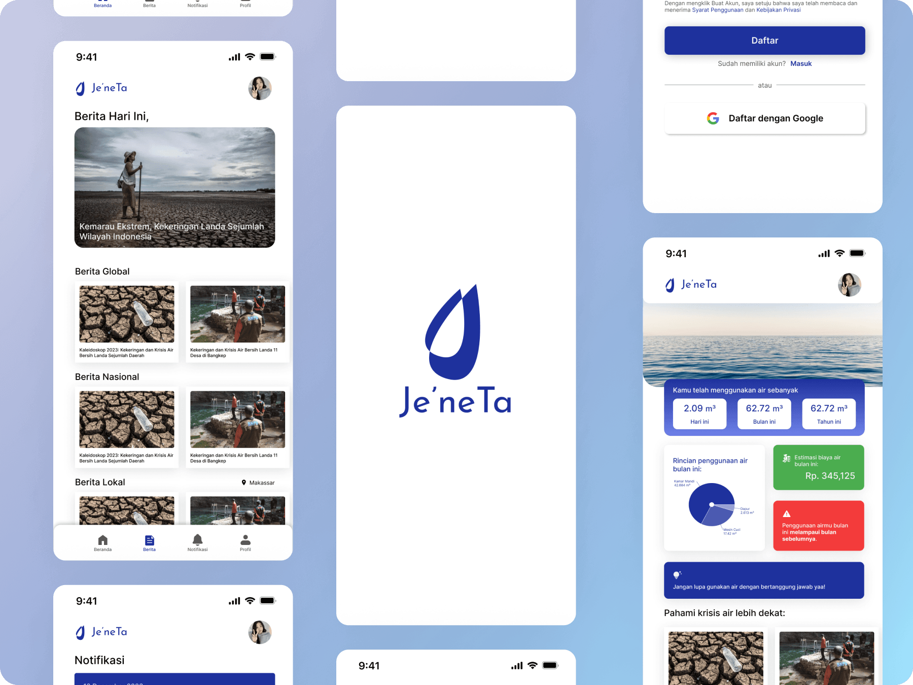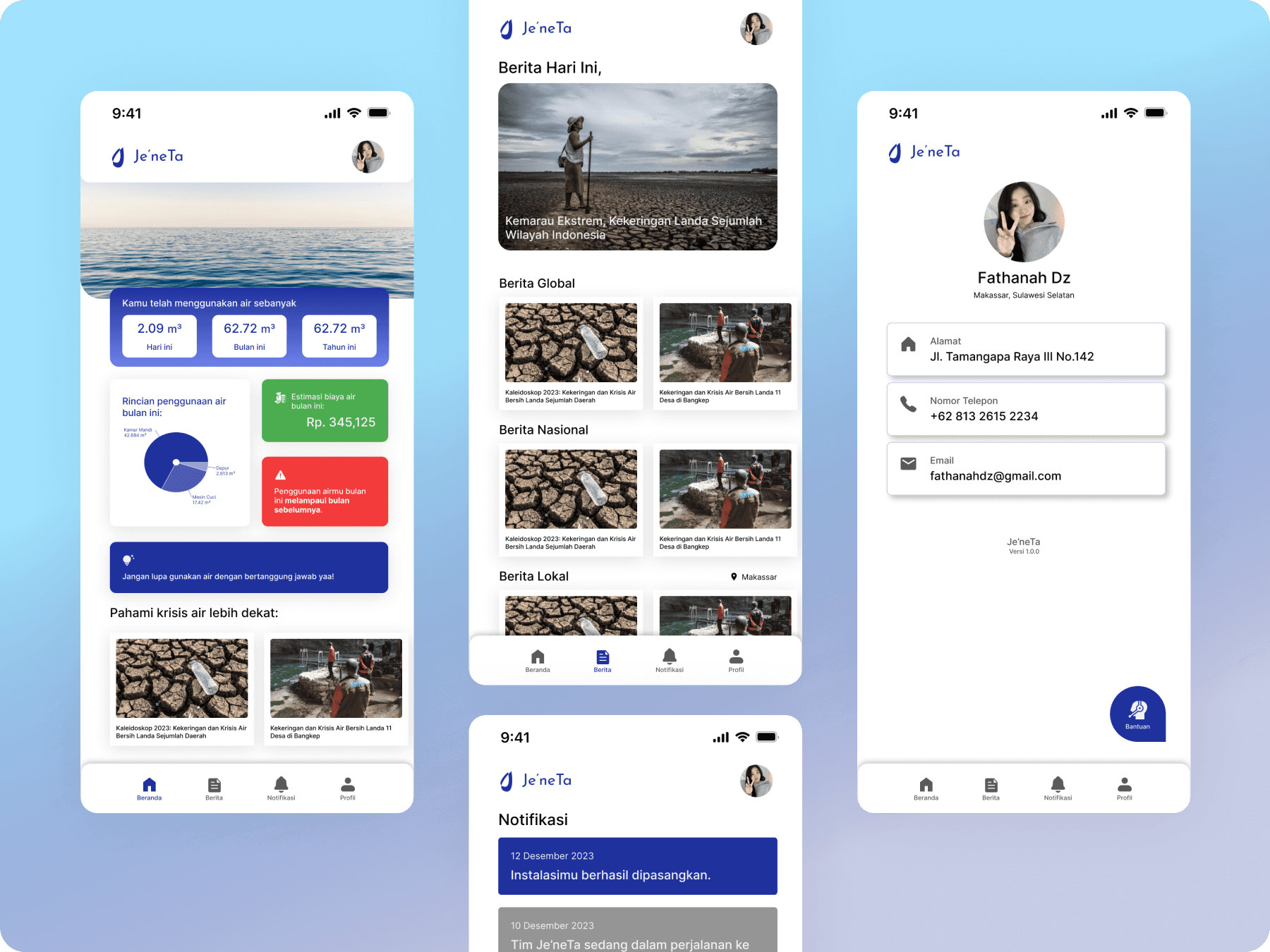 Je’neTa is a solution developed to address environmental challenges, particularly the water crisis. It allows individuals to monitor their water consumption on a daily, monthly, and yearly basis, providing detailed usage information and cost estimates. In addition, Je’neTa keeps users informed about global water crisis-related news. The term “Je’ne” comes from the Makassarese language, meaning “water”.