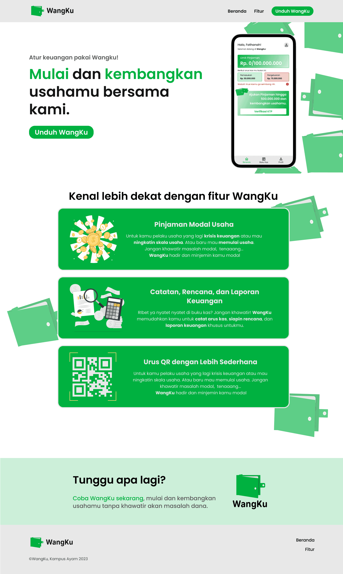 While participating in the TechnoScape Hackathon, my team and I were given a challenge to elaborate on a bank study case. We created WangKu to help MSME actors build or escalate their businesses. Additionally, we developed a website for the promotion and marketing of WangKu.