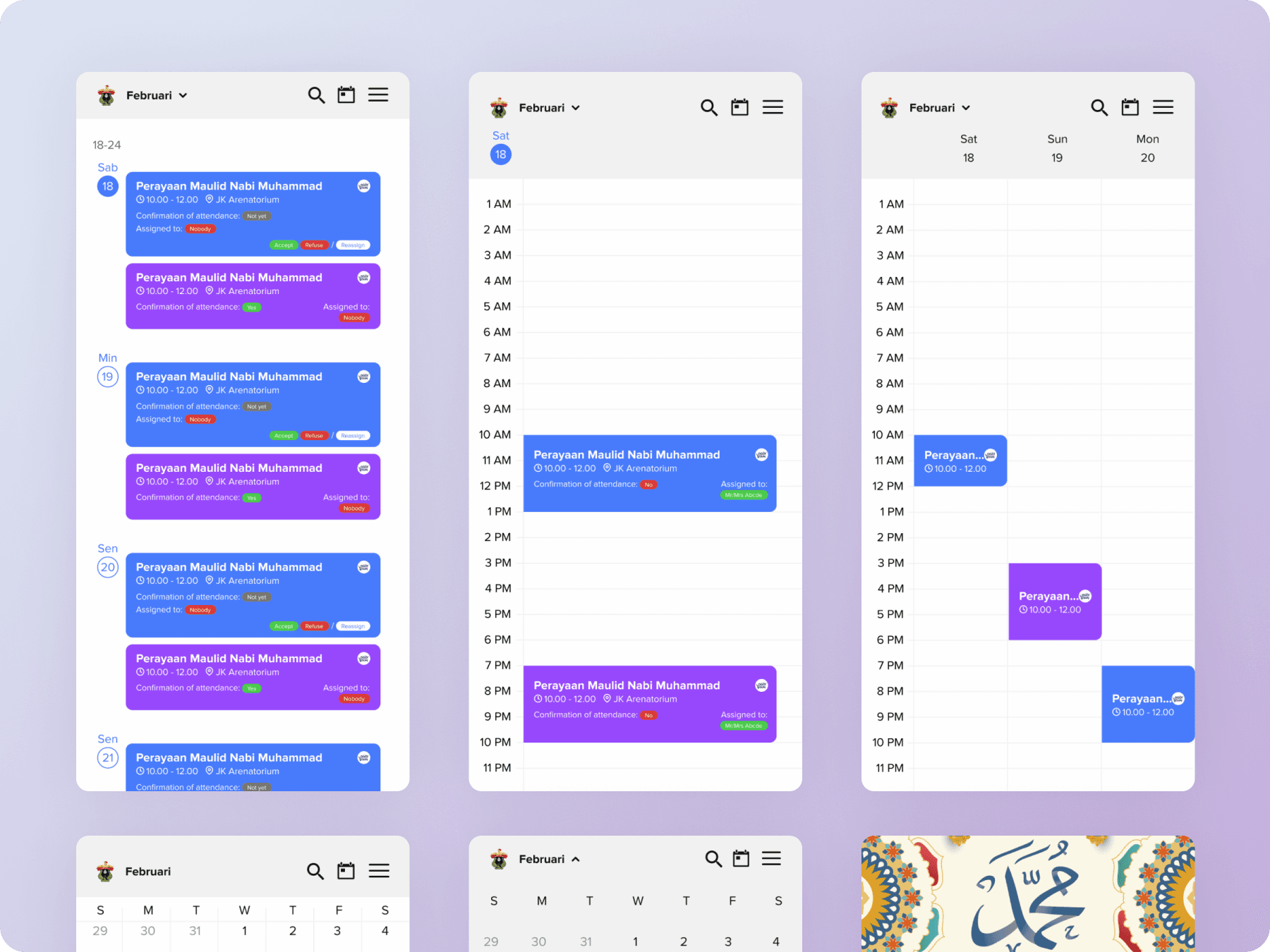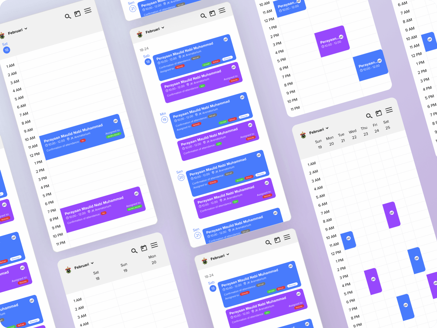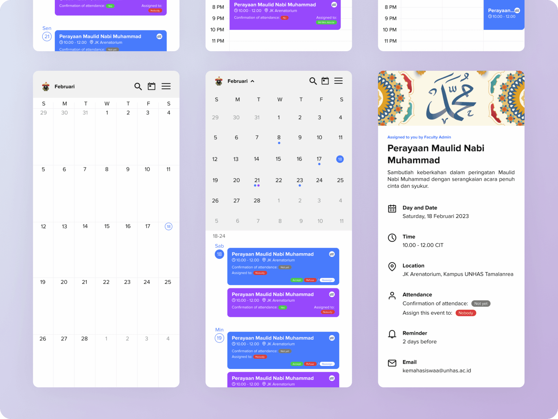 Dean, vice dean, head of departments, also lecturers faced a tight schedule of their meetings, classes, and even conferences. This application is designed so that lecturers can find out what their schedule is and can accept, reject, and assign others to take part in the event. I made this project when I joined the UI/UX Design Team of FoE Hasanuddin University.