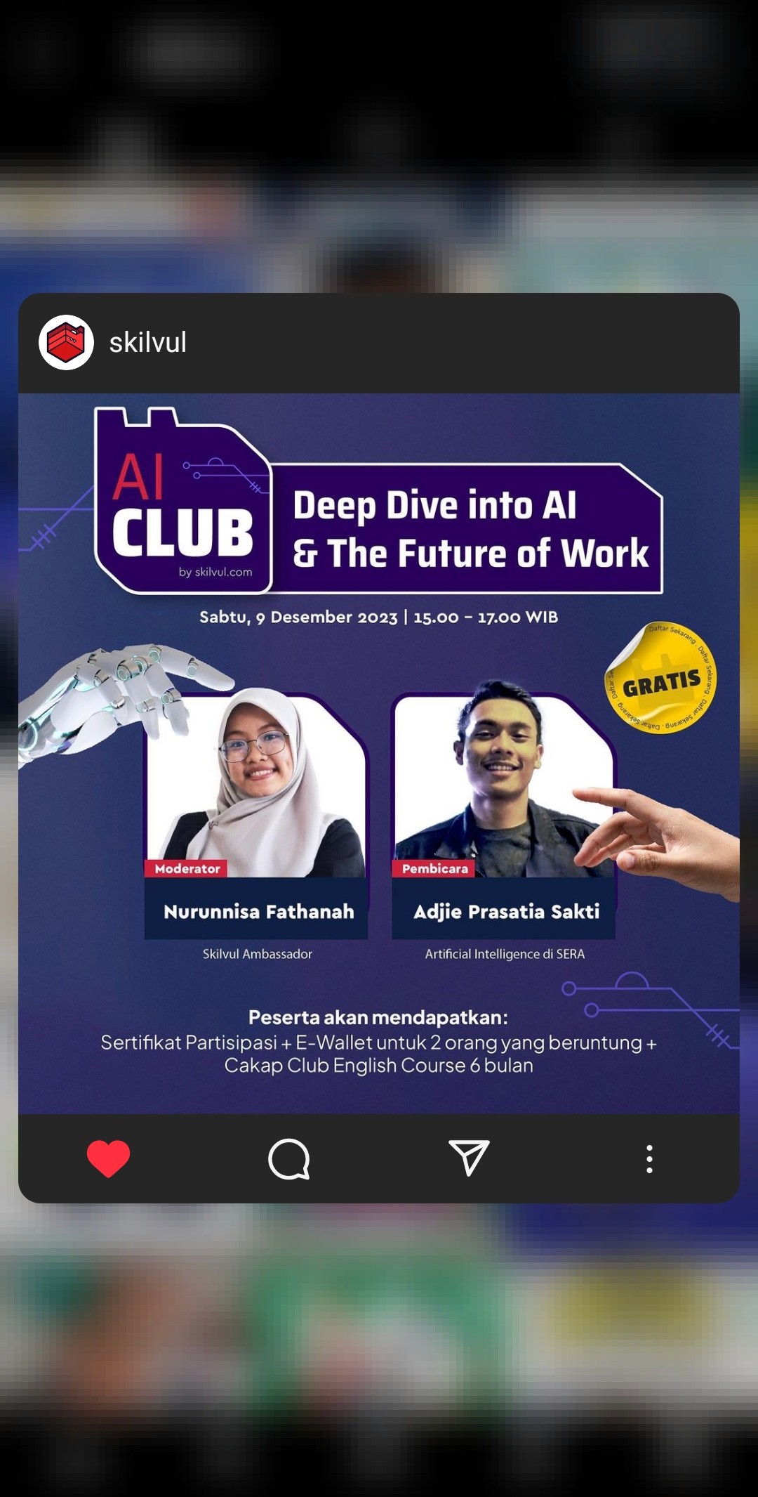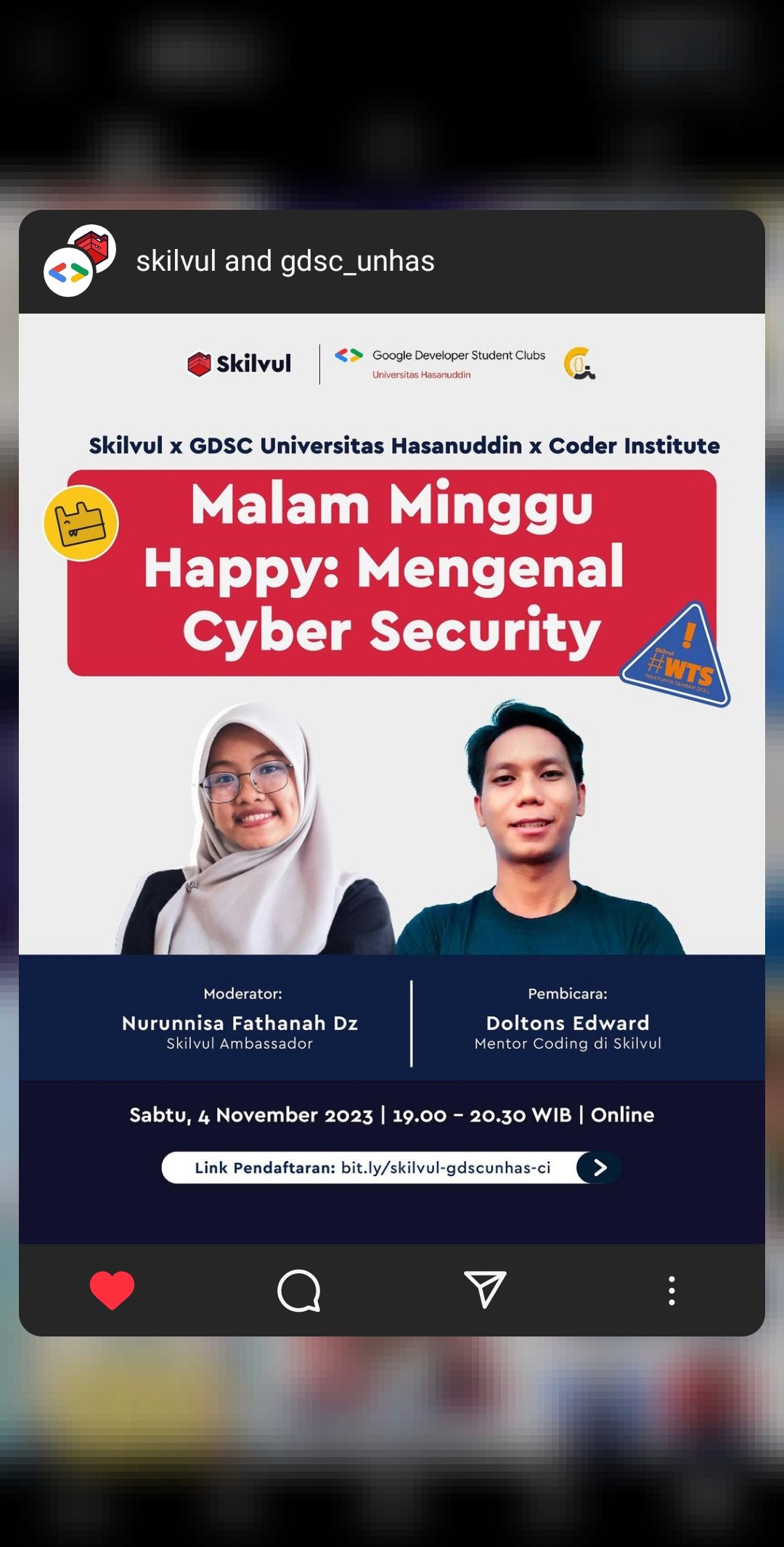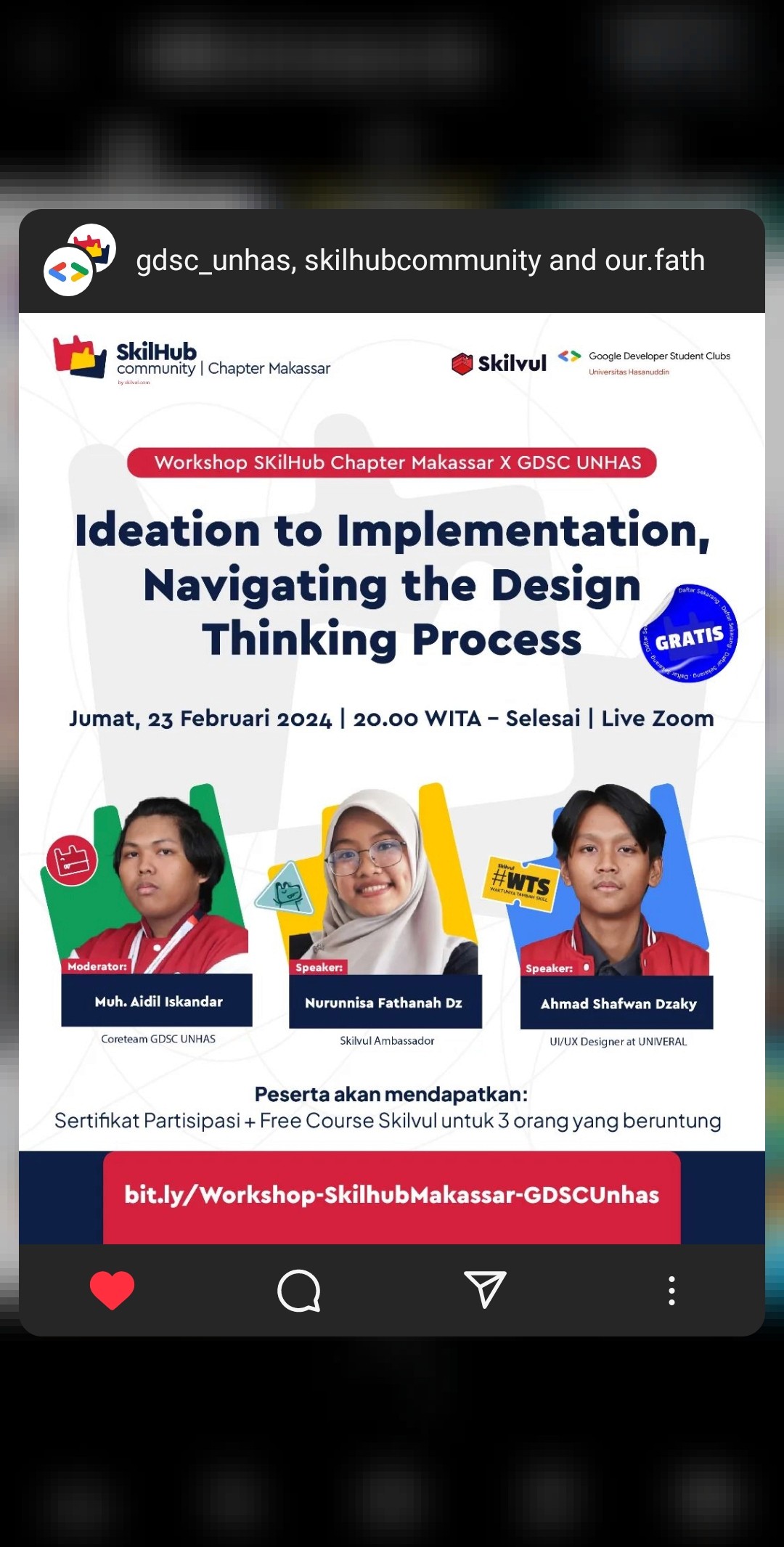Planned, arranged, accomplished, and moderated Skilvul activation through tech online webinars with the theme "Malam Minggu Happy: Mengenal Cyber Security" Collaborated with Coder Institute and GDSC UNHAS with 150+ participants, moderated AICLUB Webinar "Deep Dive into AI & The Future of Work", moderated Skilvul Tech4Impact Demo Day Full Stack Web Development, SkilHub Community Chapter Makassar activation "Ideation to Implementation, Navigating the Design Thinking Process" with 50+ participants, and SkilHub Online Conference with 1000+ participants. Also assisted members of SkilTroopers Batch 2 for the program.