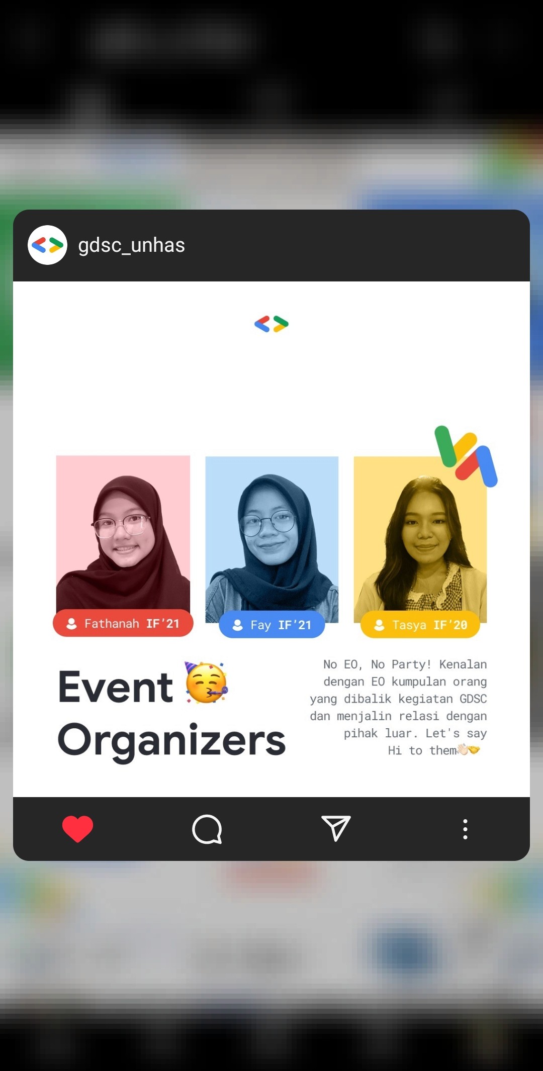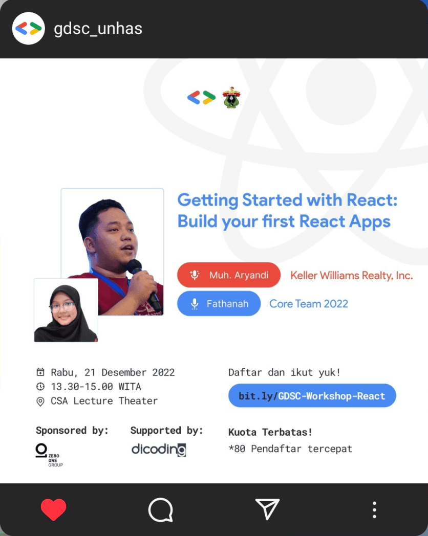 As Event Organizer at GDSC UNHAS, my responsibilities include establishing several tech event for UNHAS students. My active engagement in GDSC UNHAS activities is a significant part of my role, which includes serving as a resource person, moderator, or MC for various GDSC UNHAS programs.